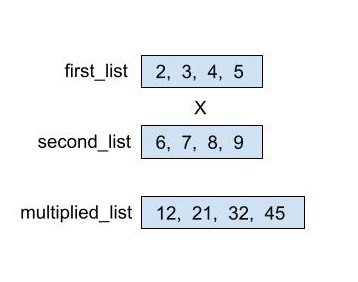 手頭的問題是使用Python計算兩個給定列表的乘積。基本上,我們將得到兩個普通的Python列表,我們必須將第一個列表的項與第二個列表的項相乘。例如,讓我們看看下面的圖片。