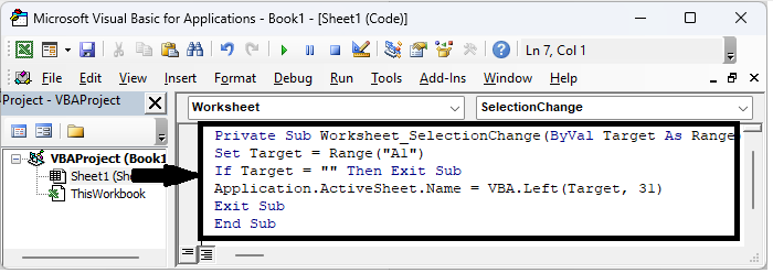 Application.ActiveSheet.Name = VBA.Left(Target, 31)