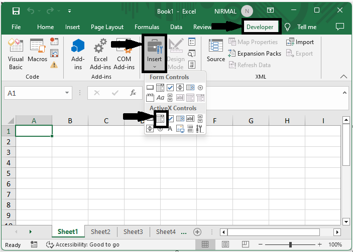 這裡我們將首先插入一個組合框,然後向其中新增VBA程式碼以完成任務。讓我們來看一個簡單的過程,瞭解如何使用Excel中的下拉列表在工作表之間導航。