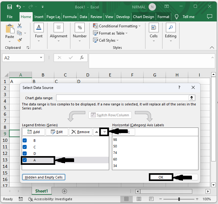 然後單擊系列 A 並將系列移動到底部。要將系列移動到底部,請單擊該系列,然後使用箭頭按鈕。