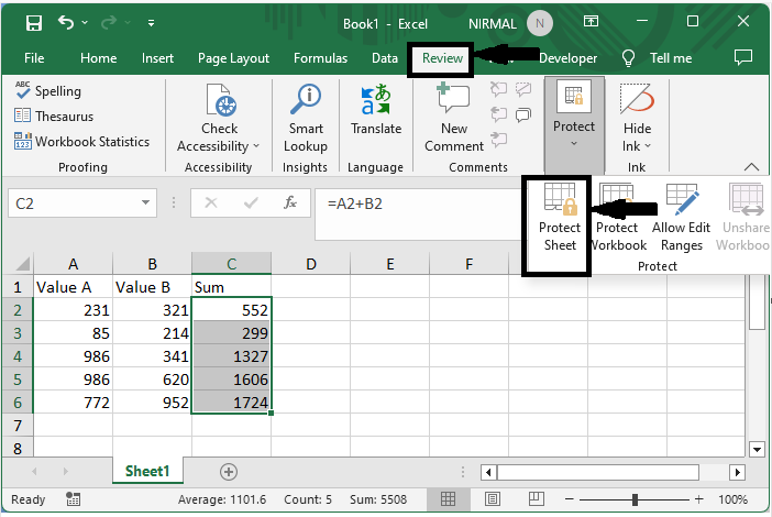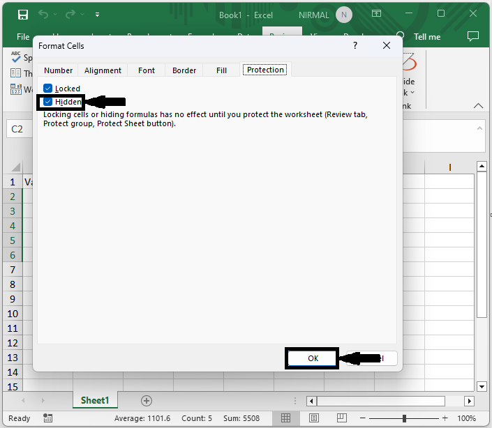 如有必要,對任何其他單元格重複相同的步驟。然後單擊“保護工作表”並在“審閱”下單擊“確定”。