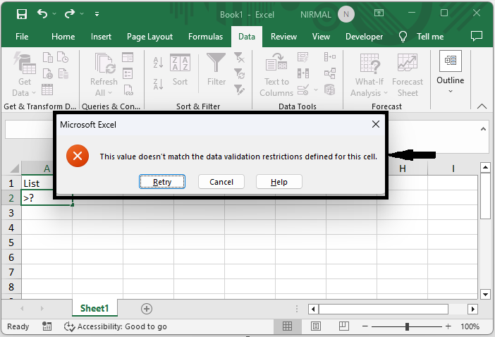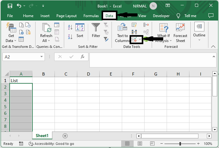 考慮任何 Excel 工作表。首先,選擇需要輸入資料的單元格範圍,然後單擊“資料”下的“資料驗證”。