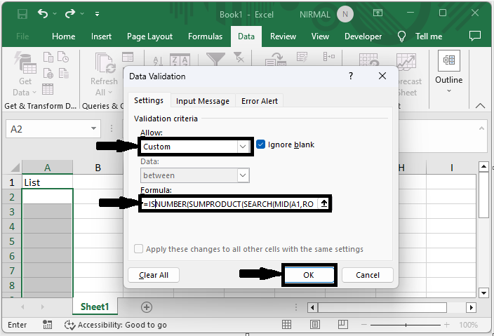 然後將“允許”設定為“自定義”,並輸入以下公式:
