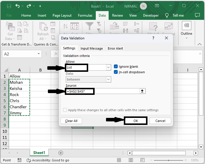 然後將“允許”設定為“列表”,將“來源”設定為要允許的單元格範圍,然後單擊“確定”以完成任務。從現在開始,當您輸入列表中以外的其他值時,將生成錯誤訊息。