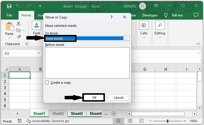 然後右鍵單擊工作表名稱並選擇“移動或複製”。然後選擇“到新工作簿”,選中名為“建立副本”的複選框,然後單擊“確定”以完成任務。