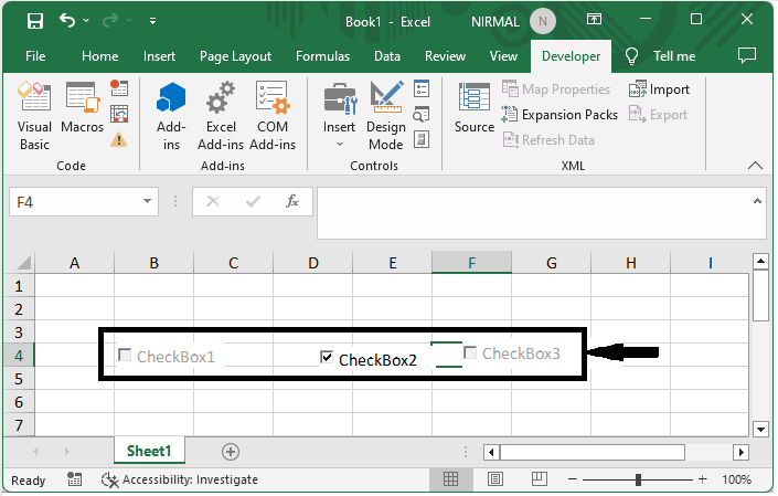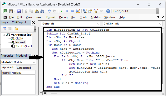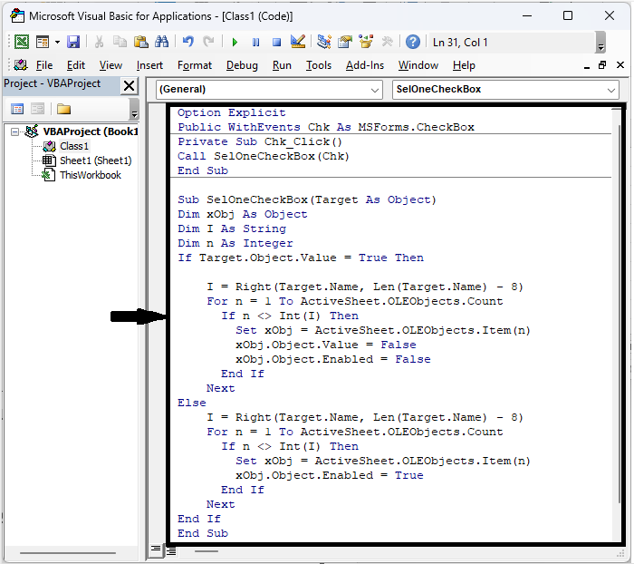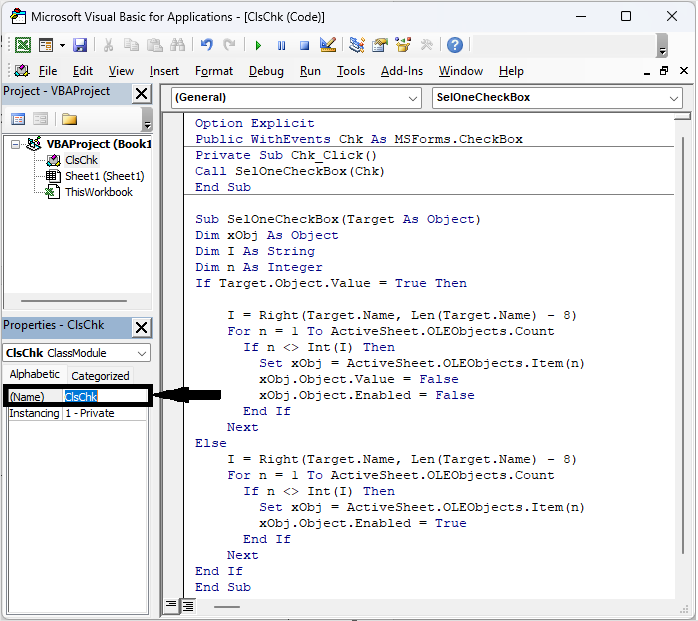 這裡我們將首先建立一個類模組,然後建立一個 VBA 模組,最後執行它來完成任務。讓我們來看一個簡單的過程,瞭解如何在 Excel 中只允許一個複選框在一個複選框組中被選中。
