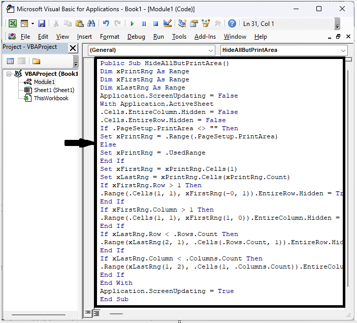 Public Sub HideAllButPrintArea() Dim xPrintRng As Range Dim xFirstRng As Range Dim xLastRng As Range Application.ScreenUpdating = False With Application.ActiveSheet .Cells.EntireColumn.Hidden = False .Cells.EntireRow.Hidden = False If .PageSetup.PrintArea <> "" Then Set xPrintRng = .Range(.PageSetup.PrintArea) Else Set xPrintRng = .UsedRange End If Set xFirstRng = xPrintRng.Cells(1) Set xLastRng = xPrintRng.Cells(xPrintRng.Count) If xFirstRng.Row > 1 Then .Range(.Cells(1, 1), xFirstRng(-0, 1)).EntireRow.Hidden = True End If If xFirstRng.Column > 1 Then .Range(.Cells(1, 1), xFirstRng(1, 0)).EntireColumn.Hidden = True End If If xLastRng.Row < .Rows.Count Then .Range(xLastRng(2, 1), .Cells(.Rows.Count, 1)).EntireRow.Hidden = True End If If xLastRng.Column < .Columns.Count Then .Range(xLastRng(1, 2), .Cells(1, .Columns.Count)).EntireColumn.Hidden = True End If End With Application.ScreenUpdating = True End Sub
