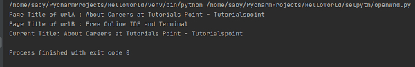 from selenium import webdriver urlA = "https://tutorialspoint.tw/about/about_careers.htm" urlB = "https://tutorialspoint.tw/questions/index.php" driver = webdriver.Chrome (executable_path="C:\chromedriver.exe") # maximize with maximize_window() driver.maximize_window() driver.get(urlA) print("Page Title of urlA : " + driver.title) # open new window with execute_script() driver.execute_script("window.open('');") # switch to new window with switch_to.window() driver.switch_to.window(driver.window_handles[1]) driver.get(urlB) print("Page Title of urlB : " + driver.title) # close window in focus driver.close() # switch back to old window with switch_to.window() driver.switch_to.window(driver.window_handles[0]) print("Current Title: " + driver.title) driver.close()