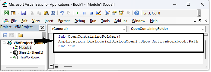 在這裡,我們將首先建立一個 VBA 模組,然後執行它來完成任務。因此,讓我們看看一個簡單的過程,瞭解如何在 Microsoft Excel 中開啟當前工作簿的包含資料夾。