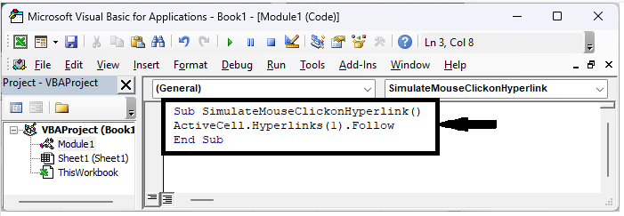 在這裡,我們將建立一個 VBA 模組,然後新增一個快捷鍵來完成任務。因此,讓我們來看一個簡單的過程來學習如何在 Excel 中不用滑鼠開啟超連結。