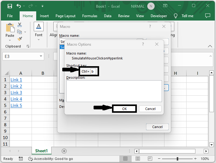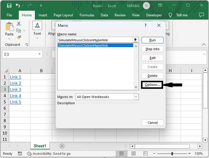 然後使用 Alt + Q 關閉 VBA。然後使用 Alt + F8 開啟“宏”對話方塊,然後單擊“選項”。