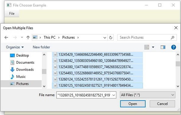 showOpenMultipleDialog() 方法顯示一個開啟對話方塊,允許您選擇多個檔案並返回一個列表(File 型別),其中包含所選檔案。如果您尚未選擇任何檔案,該方法返回 null。