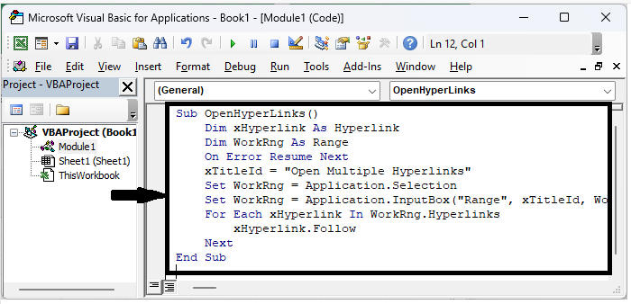 在這裡,我們將首先建立一個 VBA 模組,然後執行它來完成任務。因此,讓我們來看一個簡單的過程,瞭解如何在 Excel 中一次開啟多個超連結。