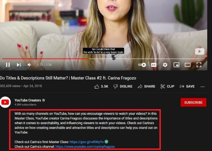 優秀的影片描述 - 與標題一樣,影片描述也應該寫得很好。前三行應該傳達影片的全部內容。使用自然語言(而不僅僅是關鍵詞)概述影片內容。經過良好最佳化的影片描述還有助於影片出現在 YouTube 側邊欄的推薦影片中,從而可能帶來更多觀看次數。如下所示