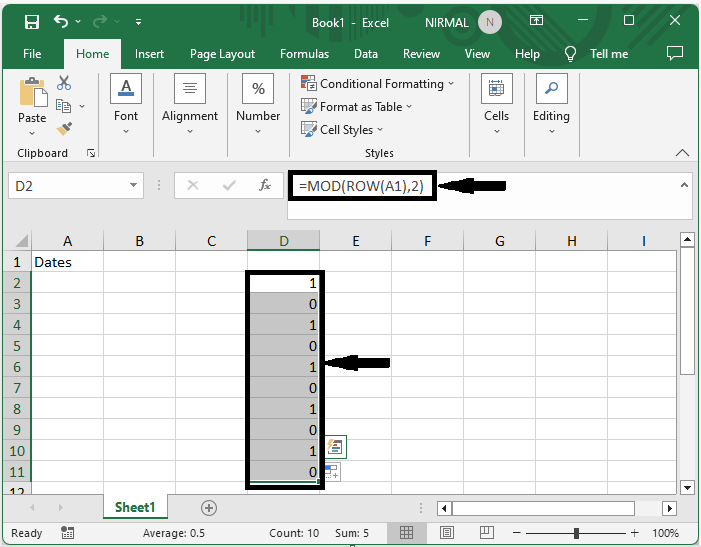 首先,單擊一個空單元格,並輸入公式 =MOD(ROW(A1),2),單擊回車,然後使用自動填充柄向下拖動。