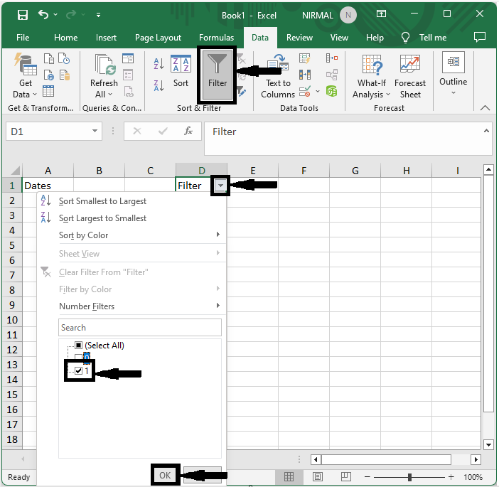 然後選擇列,並單擊“資料”下的“篩選”。然後單擊箭頭並僅選擇1或0,然後單擊“確定”以篩選單元格。