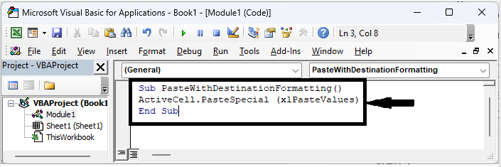 Sub PasteWithDestinationFormatting() ActiveCell.PasteSpecial (xlPasteValues) End Sub