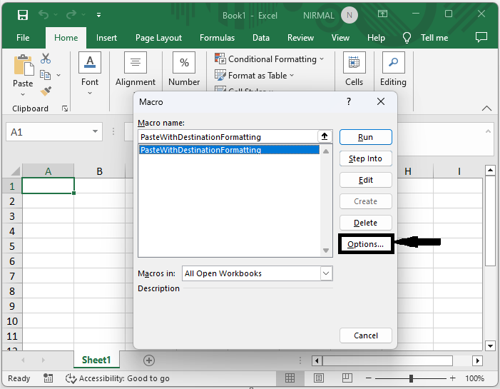 然後使用 Alt + Q 關閉 VBA。然後單擊 Alt + F8 開啟宏視窗,然後單擊“選項”。