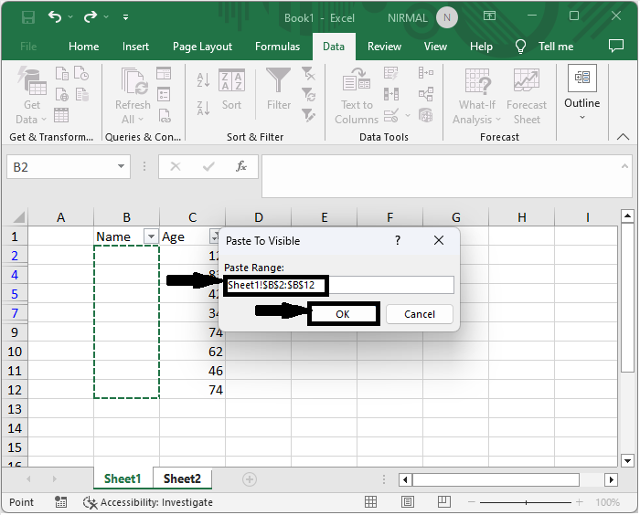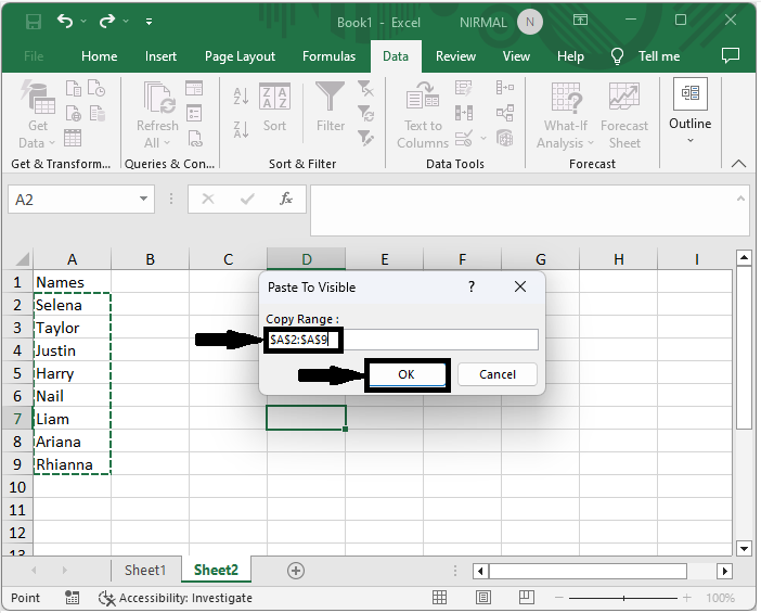 然後選擇要貼上的單元格範圍,然後單擊“確定”以完成任務。