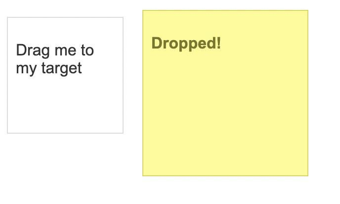 執行後,名為 Drag me to my target 的元素已被拖放到名為 Dropped! 的元素上。