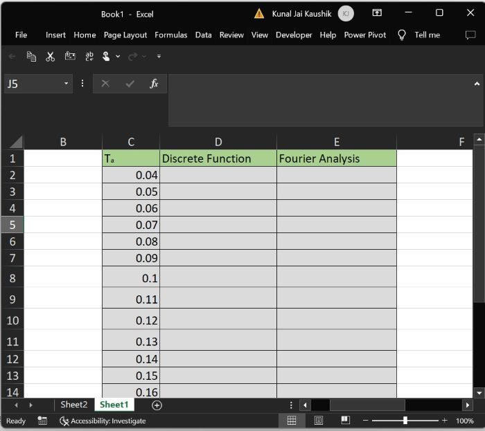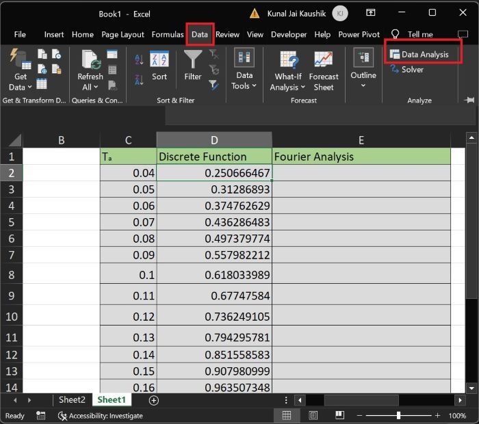 當處理跨多個範圍和工作表的大型資料集時,手動計算傅立葉分析至關重要。在處理分散在多個範圍內的海量資料集時,快速計算離散函式並快速評估傅立葉變換至關重要,而這隻有透過“資料分析”選項卡才能實現。分析師可以使用“資料分析工具庫”中提供的統計方法來發現模式、趨勢、異常和結果。在本文中,我們將學習如何使用“資料分析”選項卡計算傅立葉分析。
