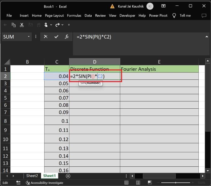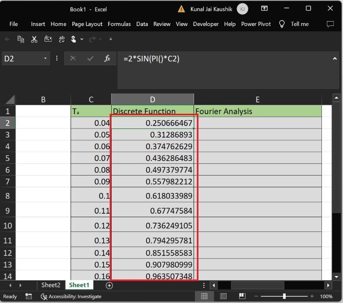 在單元格“D2”中輸入公式“=2*SIN(PI()*C2)”以計算離散函式,然後按“Enter”鍵獲取結果。