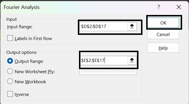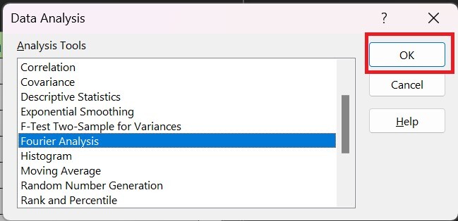 將出現另一個名為“資料分析”的對話方塊。從下拉列表中選擇“傅立葉分析”選項,然後單擊“確定”按鈕。