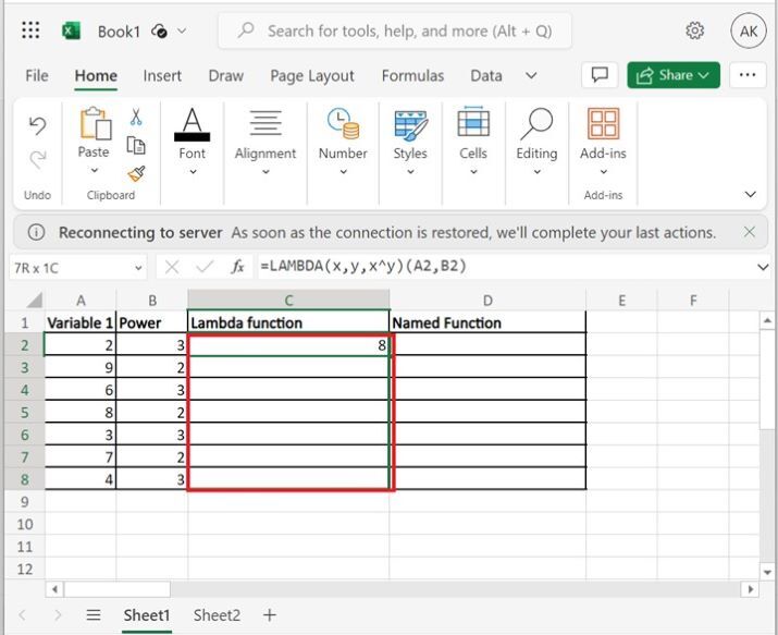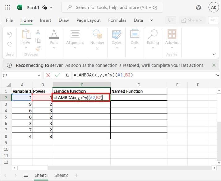 在C2單元格中輸入公式=LAMBDA(m,n,m^n)(A2,B2),然後按Enter鍵。