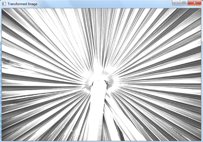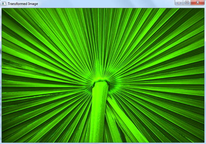 # import required libraries import cv2 import numpy as np # read input image img = cv2.imread('leaf1.jpg') # define transformation matrix m = np.ones((3,3)) # apply the cv2.transform to perform matrix transformation img_tr = cv2.transform(img, m, None) # display the transformed image cv2.imshow("Transformed Image", img_tr) cv2.waitKey(0) cv2.destroyAllWindows()