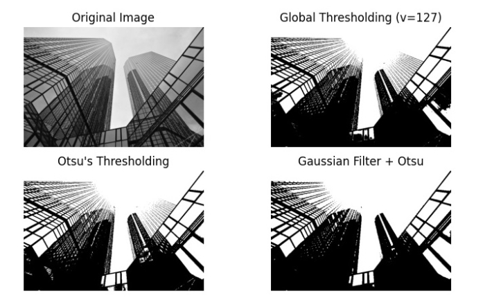 以上輸出顯示了應用全域性閾值分割、Otsu 閾值分割和高斯濾波 + Otsu 閾值分割後的不同影像。