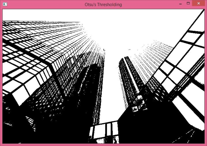 # import required libraries import cv2 # read the input image as a gray image img = cv2.imread('architecture2.jpg',0) # Apply Otsu's thresholding _,th = cv2.threshold(img,0,255,cv2.THRESH_BINARY+cv2.THRESH_OTSU) # display the output image cv2.imshow("Otsu's Thresholding", th) cv2.waitKey(0) cv2.destroyAllWindows()