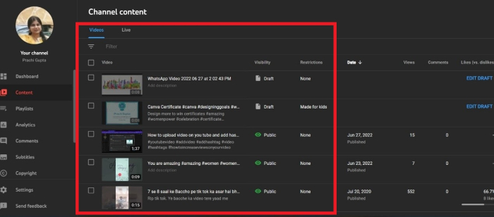 您的 YouTube 頻道內容頁面將開啟。這將方便您選擇要刪除的影片。