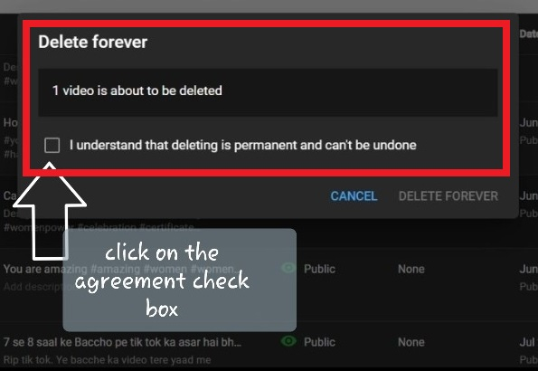 YouTube 將顯示訊息“即將刪除 1 個影片”。只需單擊複選框即可確認同意。