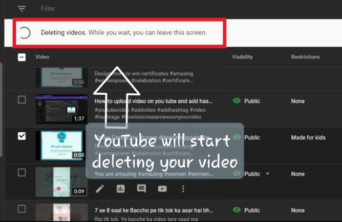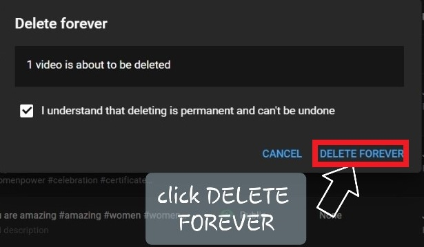 單擊複選框後,“永久刪除”將變為藍色。只需點選它。YouTube 將開始永久刪除您的影片。這需要幾分鐘。
