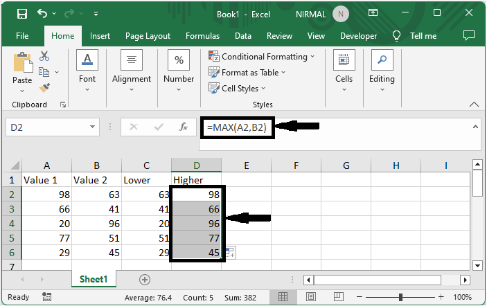現在,要選擇兩個單元格中的最大值,請單擊一個空單元格,輸入公式 =MAX(A2,B2),然後單擊回車。然後使用自動填充柄向下拖動。