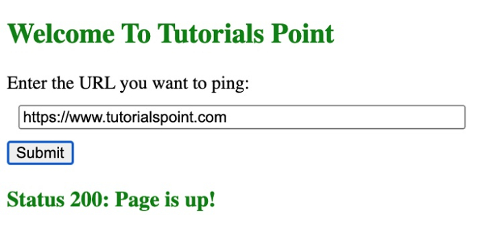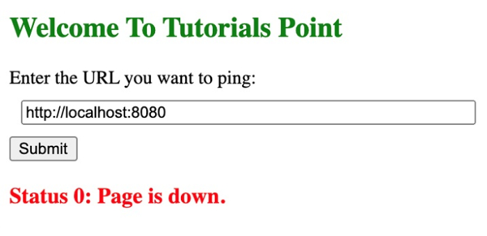 我們可以使用 **JavaScript** 函式向伺服器傳送 Ping 訊息。在本教程中,我們將使用 **AJAX** 功能傳送 Ping,並在收到 Pong 後顯示響應。我們還將檢查收到的狀態程式碼以確定伺服器是否處於活動狀態。如果收到除 200 之外的任何狀態,則表示伺服器未處於活動狀態或工作不正常。