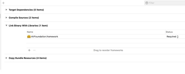 步驟 5 - 導航到您的專案構建階段,並新增 AVFoundation 框架,如所示。