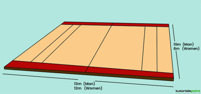 根據卡巴迪規則,競技男子卡巴迪比賽場地的尺寸為 13 米 x 10 米。女子比賽場地較小,尺寸為 12 米 x 8 米。但是,國際和地方比賽的尺寸可能有所不同。