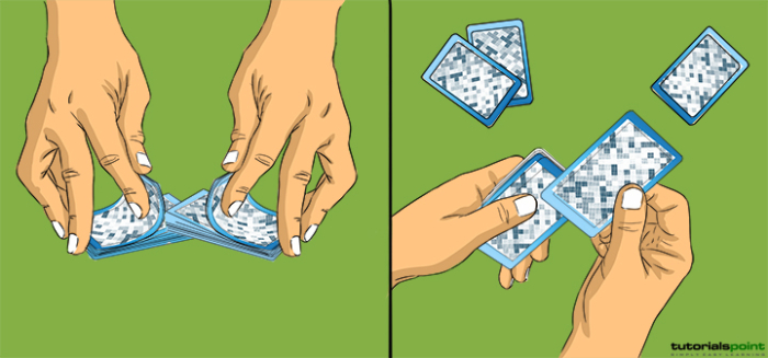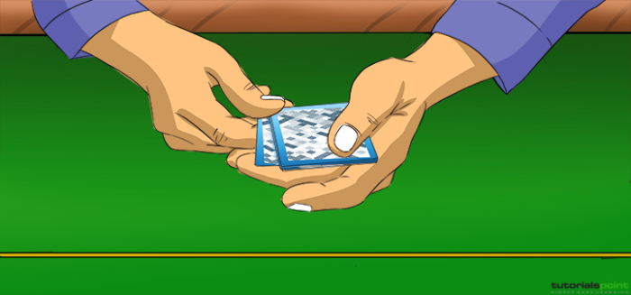 在發牌前,牌組要充分洗牌,這是一種技巧。洗牌是為了混合牌,使遊戲更公平。通常會洗牌幾次。將牌組分成兩半。將兩半放在彼此相對的位置,用拇指翻牌,最後形成一疊牌。莊家按順時針方向發兩張牌,從左邊開始。