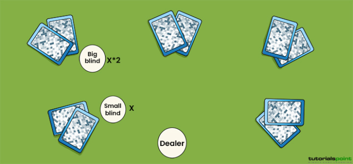 在德州撲克中,遊戲開始時,每位玩家會收到兩張牌,稱為底牌,牌面朝下。它們是私密的,不能向其他玩家透露。在所有牌都發給玩家後(每人兩張),就進行盲注。盲注是指兩位玩家(按順時針方向坐在莊家旁邊)出的最小和最大盲注。盲注確保每一輪都有籌碼。大盲注通常是小的盲注的兩倍。此外,每個玩家都可以追加最小起始賭注,將其放入底池。