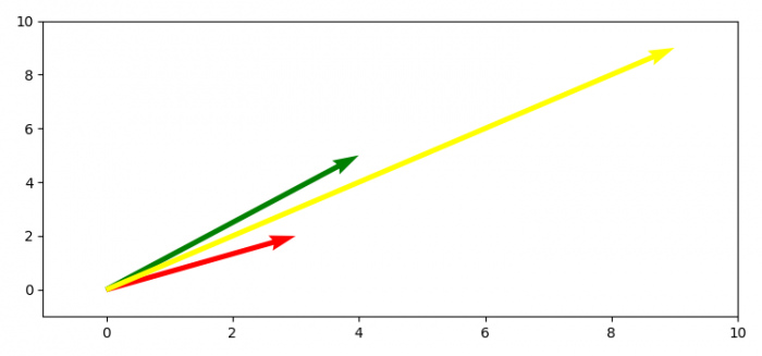 import numpy as np import matplotlib.pyplot as plt plt.rcParams["figure.figsize"] = [7.50, 3.50] plt.rcParams["figure.autolayout"] = True soa = np.array([[0, 0, 3, 2], [0, 0, 4, 5], [0, 0, 9, 9]]) X, Y, U, V = zip(*soa) plt.figure() ax = plt.gca() ax.quiver(X, Y, U, V, angles='xy', scale_units='xy', scale=1, color=['red', 'green', 'yellow']) ax.set_xlim([-1, 10]) ax.set_ylim([-1, 10]) plt.draw() plt.show()