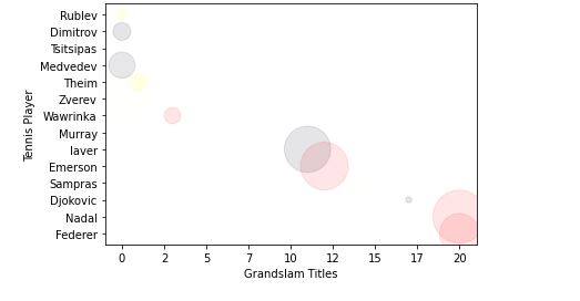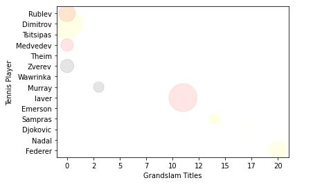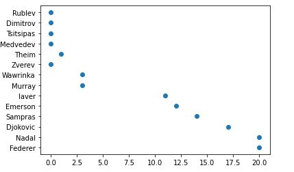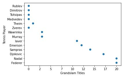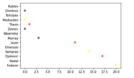 tennis_stats = (('Federer', 20),('Nadal', 20),('Djokovic', 17),('Sampras', 14),('Emerson', 12),('laver', 11),('Murray', 3),('Wawrinka', 3),('Zverev', 0),('Theim', 1),('Medvedev',0),('Tsitsipas', 0),('Dimitrov', 0),('Rublev', 0))3. 下一步是以任何陣列格式準備資料。我們也可以從資料庫或電子表格中讀取資料,並將資料格式化為如下格式。