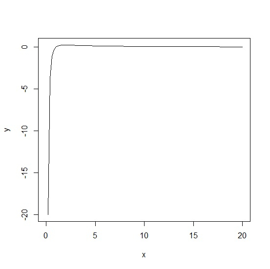 > curve((x-1)/(x^2),from=0, to=20,ylab="y")