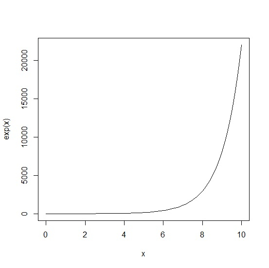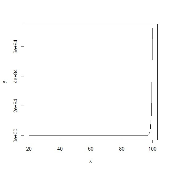 > curve(((exp(x))^2)/(x),from=20, to=100,ylab="y")