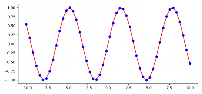 import numpy as np from scipy.interpolate import pchip import matplotlib.pyplot as plt plt.rcParams["figure.figsize"] = [7.50, 3.50] plt.rcParams["figure.autolayout"] = True N = 50 x = np.linspace(-10, 10, N) y = np.sin(x) interp = pchip(x, y) plt.plot(x, interp(x), color='red') plt.plot(x, y, 'bo') plt.show()