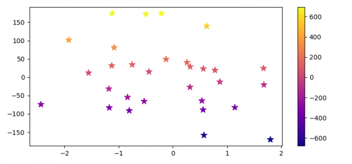 import numpy as np import matplotlib.pyplot as plt plt.rcParams["figure.figsize"] = [7.50, 3.50] plt.rcParams["figure.autolayout"] = True def func(x, y): return 3 * x + 4 * y - 2 + np.random.randn(30) x, y = np.random.randn(2, 30) y *= 100 z = func(x, y) fig, ax = plt.subplots() s = ax.scatter(x, y, c=z, s=100, marker='*', cmap='plasma') fig.colorbar(s) plt.show()