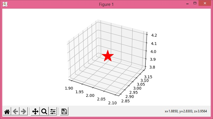 from matplotlib import pyplot as plt plt.rcParams["figure.figsize"] = [7.50, 3.50] plt.rcParams["figure.autolayout"] = True fig = plt.figure() ax = fig.add_subplot(111, projection='3d') ax.scatter(2, 3, 4, c='red', marker='*', s=1000) plt.show()