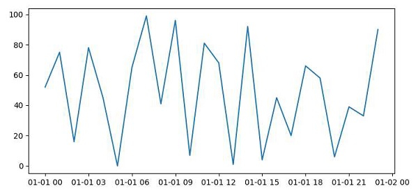import matplotlib.pyplot as plt import datetime import numpy as np plt.rcParams["figure.figsize"] = [7.50, 3.50] plt.rcParams["figure.autolayout"] = True x = np.array([datetime.datetime(2021, 1, 1, i, 0) for i in range(24)]) y = np.random.randint(100, size=x.shape) plt.plot(x, y) plt.show()
