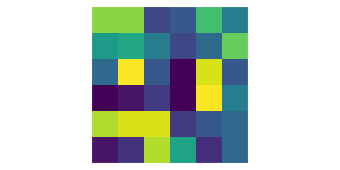 from matplotlib.animation import FuncAnimation import matplotlib.pyplot as plt import numpy as np plt.rcParams["figure.figsize"] = [7.00, 3.50] plt.rcParams["figure.autolayout"] = True fig, ax = plt.subplots() def update(i): im_normed = np.random.rand(6, 6) ax.imshow(im_normed) ax.set_axis_off() anim = FuncAnimation(fig, update, frames=20, interval=50) plt.show()