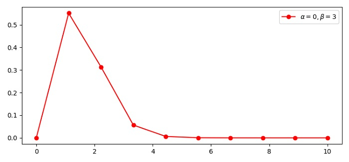 import numpy as np import scipy.stats as stats from matplotlib import pyplot as plt plt.rcParams["figure.figsize"] = [7.50, 3.50] plt.rcParams["figure.autolayout"] = True x = np.linspace(0, 10, 10) y = stats.gamma.pdf(x, a=5, scale=0.333) plt.plot(x, y, "ro-", label=(r'$\alpha=0, \beta=3$')) plt.legend(loc='upper right') plt.show()